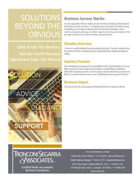 For information about sales & use tax reporting, contact Gerad Levey, Senior Analyst, at 716.633.1373 or glevey@tronconisegarra.com.